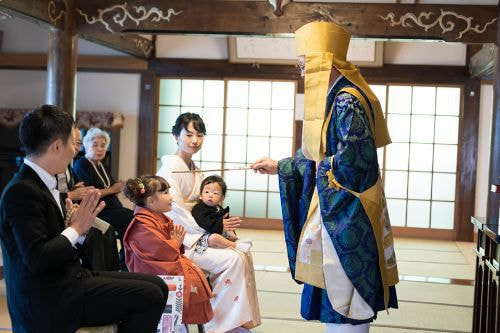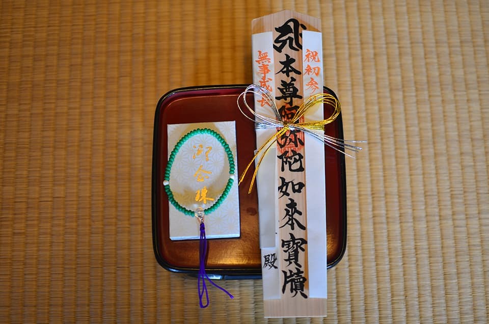 ※お初参り記念の「お数珠(グリーン/ピンク)」「お札」をお授けいたします